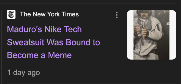 Simply: it’s a very big deal to send American Special Forces into Venezuela early in the morning and extract (kidnap?) their sitting president and his wife from their home and bring them back to the United States. However, hours after it happened our president posted a picture of their president onboard an American aircraft carrier in a grey Nike jumpsuit and some other memorable garb. It’s an incredibly memorable picture, and probably would’ve been just as memorable if the tracksuit had been green or blue or white, but maybe not if it he’d been in an actual (business) suit.